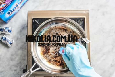 - Для стойкого пригорания можно влить в кастрюлю уксус и довести до кипения на слабом огне на 5–7 минут. Осторожно удаляйте остатки нагарa, промойте и промойте чистой водой. В конце протрите поверхность сухой тканью.